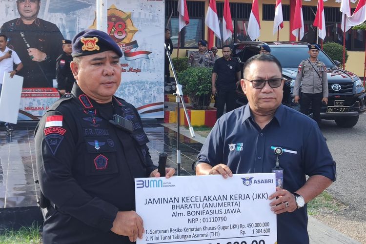 Komisaris Utama PT ASABRI (Persero) Fary Djemi Francis menyerahkan uang santunan sebesar Rp 451.304.600 kepada ahli waris Bharada Anumerta Bonifasius Jawa. Penyerahan santunan itu diterima Komandan Satuan Tugas Brimob Polda NTT Kombes Fery Raymond Ukoli di Markas Brimob Polda NTT pada Jumat (24/11/2023). Santunan itu rencananya akan diteruskan ke ahli waris Bonifasius Jawa di Bajawa di Kabupaten Ngada.