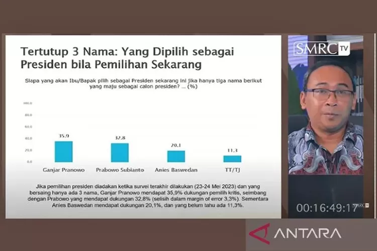 “Ganjar dan Prabowo bersaing ketat memperebutkan urutan teratas, sementara Anies di urutan ketiga dengan selisih suara signifikan dengan Prabowo dan Ganjar,” kata Direktur Riset SMRC Deni Irvani dalam pemaparan secara daring, Senin (29/7).