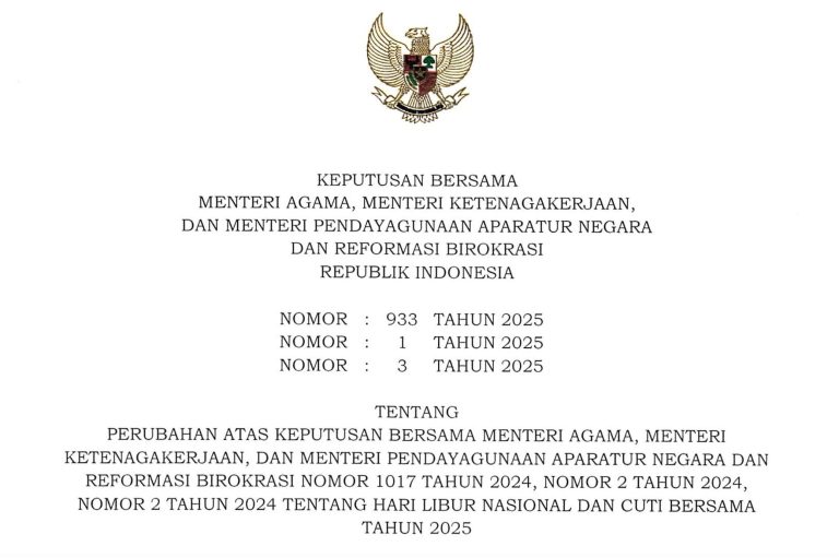 Kampiunnews | Jakarta – Pemerintah Republik Indonesia secara resmi menetapkan Senin, 18 Agustus 2025, sebagai cuti bersama nasional dalam rangka memeriahkan Hari Ulang Tahun Ke-80 Kemerdekaan Republik Indonesia. Penetapan ini dituangkan dalam Surat Keputusan Bersama (SKB) Tiga Menteri yang ditandatangani oleh Menteri Agama (Menag), Menteri Ketenagakerjaan (Menaker), dan Menteri Pendayagunaan Aparatur Negara dan Reformasi Birokrasi (PANRB).
