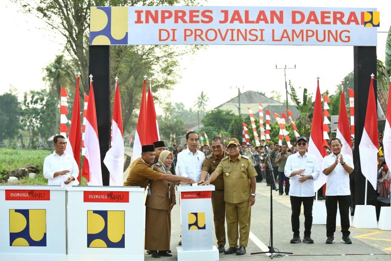 Kampiunnews | Lampung – Menteri Pekerjaan Umum dan Perumahan Rakyat (PUPR) Basuki Hadimuljono mendampingi Presiden Joko Widodo meresmikan perbaikan 16 ruas jalan di Provinsi Lampung yang dilaksanakan melalui Inpres Jalan Daerah (IJD). Peresmian ditandai dengan penekanan tombol sirine oleh Presiden Jokowi di ruas Keramat Teluk – Sri Widodo, Kamis (11/7).
