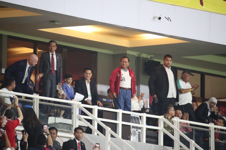 Kampiunnews I Surabaya – Menteri Pertahanan Prabowo Subianto bersama Presiden Joko Widodo (Jokowi); Ibu Negara Iriana; Ketua Umum PSSI Erick Thohir; dan Ketua MPR Bambang Soesatyo menyaksikan laga perdana Piala Dunia U-17 antara Indonesia melawan Ekuador di Stadion Gelora Bung Tomo, Surabaya, Jumat (10/11).