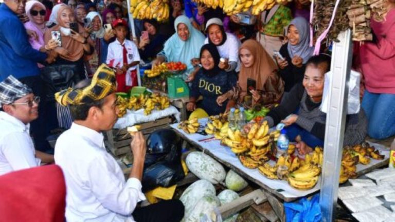 Langkah Presiden Jokowi terhenti di satu lapak pedagang pisang. Rupanya, Presiden Jokowi ingin mencicipi pisang susu yang dijual di lapak tersebut. Presiden pun duduk berjongkok dan mencicipi beberapa buah pisang.