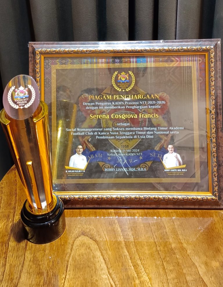 Salah satu penerima KADIN NTT Award 2024 adalah Serena Cosgrova Francis. KADIN NTT memberikan penghargaan kepada Serena salah satu generasi muda yang telah ikut membantu dan menggerakkan sepakbola di provinsi berbasis kepulauan itu.
