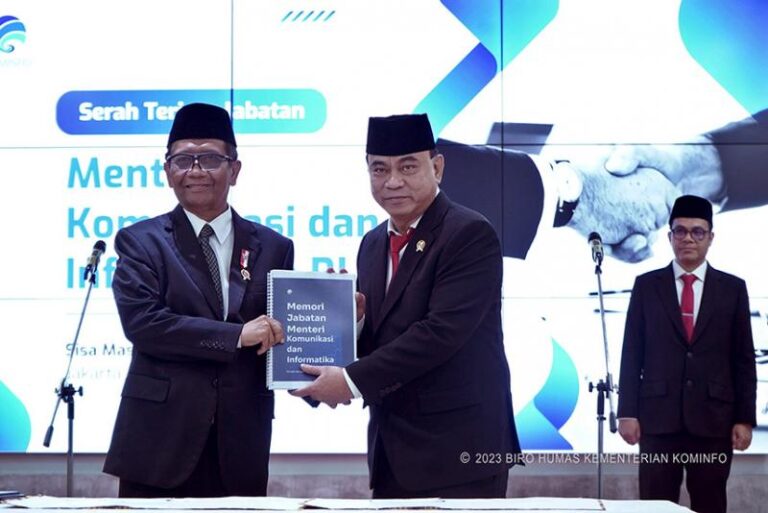 Kampiunnews | Jakarta – Pelaksana Tugas Menteri Komunikasi dan Informatika Mahfud MD menyerahkan tugas kementerian kepada Budi Arie Setiadi sebagai Menteri Kominfo yang baru dilantik oleh Presiden Joko Widodo. Serah terima jabatan berlangsung sekitar pukul 11.40 WIB diawali dengan penyerahan memori jabatan Plt Menkominfo.