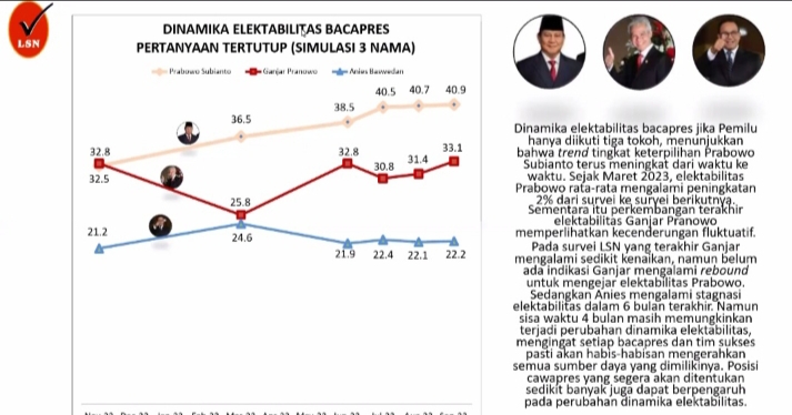 Kampiunnews I Jakarta —Empat bulan menuju pemilihan Presiden Lembaga Survei Nasional (LSN) mengungkap hasil temuan survei teranyar bahwa posisi Prabowo lagi-lagi teratas unggul signifikan capai 12,3% atas Ganjar jika Head to Head Bakal Calon Presiden (Bacapres) Prabowo Subianto versus Ganjar Pranowo.