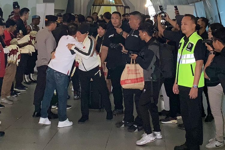 Pengalungan bunga dilakukan sebagai tanda sambutan. Pelatih Shin Tae Yong terlihat berpelukan dengan Sekjen PSSI Yunus Nusi. Turut hadir Komite Eksekutif (Exco) Arya Sinulingga.