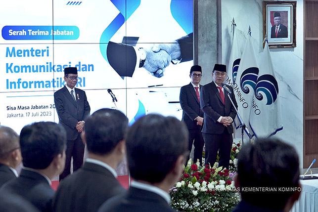“Kita optimis bahwa Indonesia Maju seperti yang dicanangkan Pak Presiden ini bisa kita wujudkan dalam gerak langkah di Kementerian Komunikasi dan Informatika,” ungkap Menteri Komunikasi dan Informatika Budi Arie Setiadi dalam Serah Terima Jabatan di Kantor Kementerian Kominfo, Jakarta Pusat, Senin (17/07/2023).